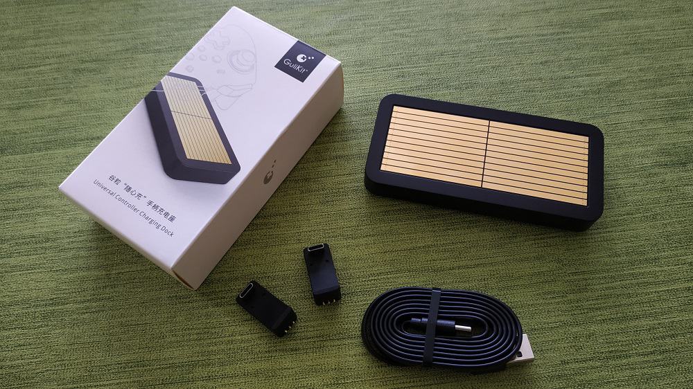 Fourni avec, un câble plat USB/USB-C. De bonne facture, on pourra lui reprocher de ne faire qu’un mètre selon notre installation. Pour finir, nous trouvons deux adaptateurs manettes correspondants au modèle choisi. En effet, dans ce “kit de base”, nous trouvons le socle de charge et deux adaptateurs mais sachez que ces derniers peuvent être achetés à l’unité par la suite. Au moment où j’écris ces lignes, les modèles PS5, PS4, XBOX-ONE, Switch Pro et GuliKit King Kong sont disponibles.